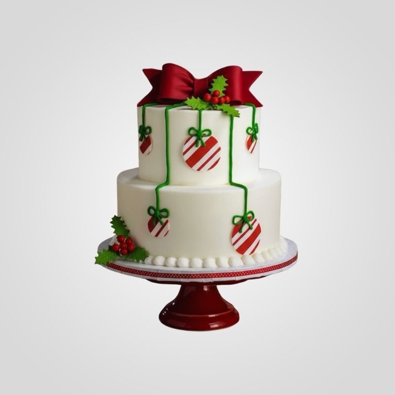 The Christmas Gift cake is a grand and beautiful treat that looks just like a special present. This two tiered white cake is decorated with cute hanging red and white striped ornaments on green strings. It is crowned with a big red bow and finished with holly leaves and berries at the base to create a perfect Christmas cake.
