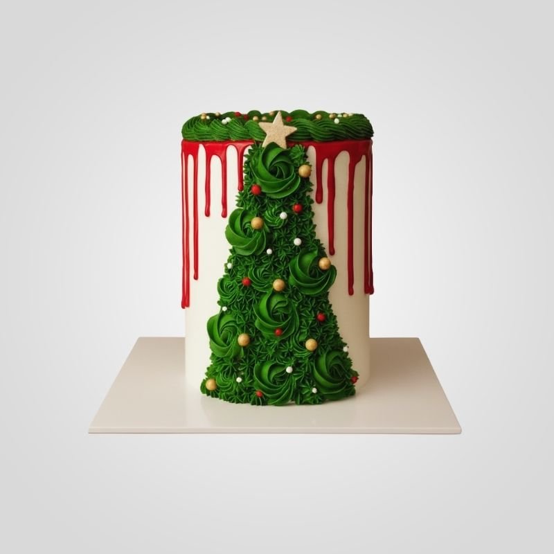 The Christmas Tree Drip Cake is a stunning and tasty choice for your holiday season. This tall white cake features a rich red chocolate drip cascading down the sides and a beautiful green piped tree on the front. The tree is decorated with gold and red beads and topped with a shining star to make a perfect Christmas cake.