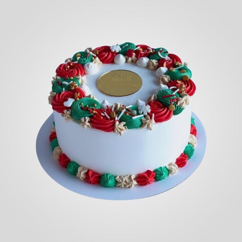 The Christmas Wreath Cake is a classic and colorful choice for your holiday celebration. This smooth white cake features a beautiful ring of red, green, and cream swirls on top that looks just like a festive wreath. It is decorated with fun sprinkles and a shiny gold sign in the center to create a perfect Christmas cake.