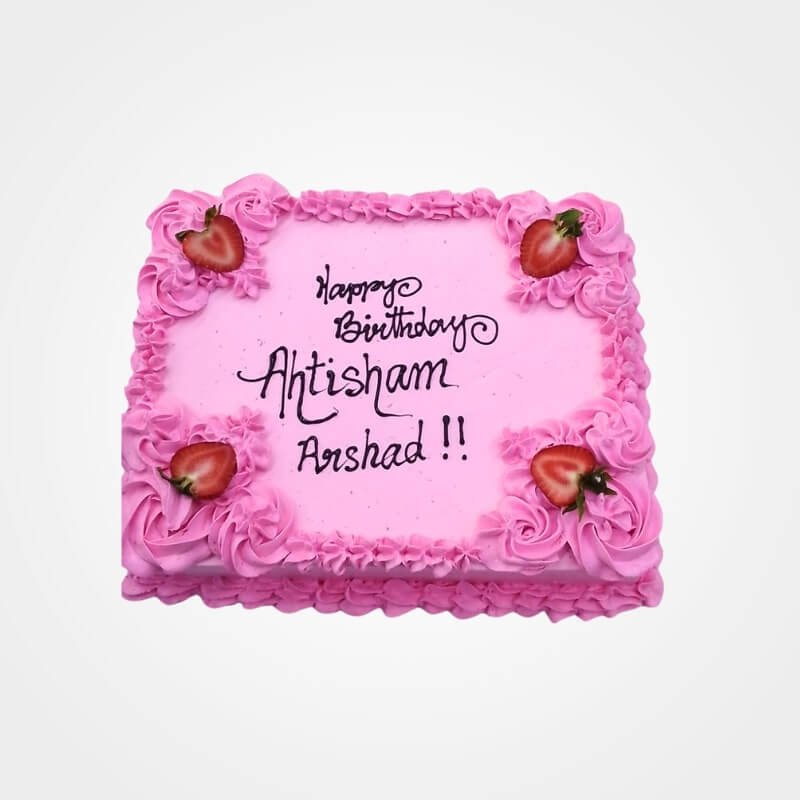 This Classic Rosette Cake is a delightful square creation, perfect for any sweet celebration. Frosted in vibrant pink and made entirely with smooth fresh cream, it features an elegant border of piped rosettes that add a timeless, classic charm. Each corner is topped with fresh strawberry halves, adding a burst of flavor and freshness to this lovely strawberry cake.