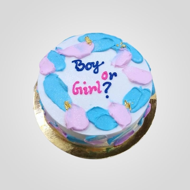 Find out the exciting news with our sweet Gender Reveal Cake. This lovely theme cake is designed to build the suspense and joy of your special moment. It has a clean white frosting base, decorated with pretty strokes of pink and blue, and the exciting question “Boy or Girl?” right on top. A few flakes of gold leaf add a little sparkle to this wonderful cake.