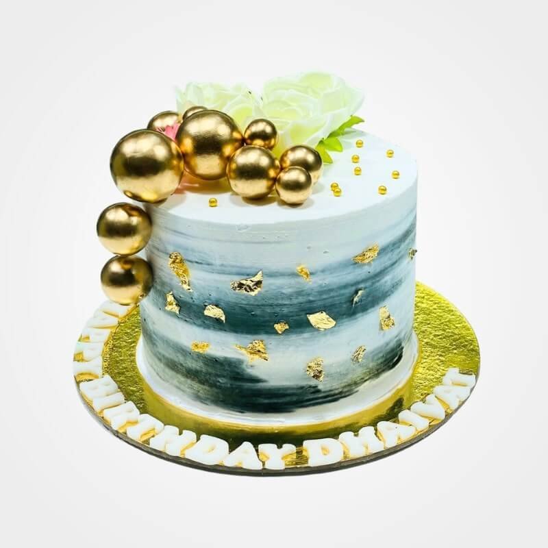 The Gold Marble Cake is a modern masterpiece that exudes elegance. Its stunning black and white marbled finish, accented with real gold leaf, creates a bold and luxurious look. A cascade of glossy golden spheres and delicate white roses, all crafted with smooth fresh cream, adds a sophisticated touch.
