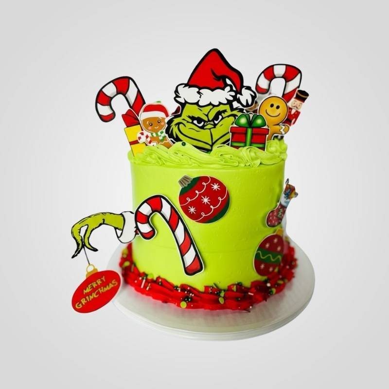 The Grinch themed Christmas cake is a fun and playful treat for the holidays. This bright lime green cake features the famous Grinch character on top along with candy canes and cute gingerbread men. It is decorated with a red border and a Merry Grinchmas sign to create a very funny Christmas cake.