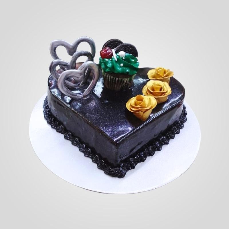 Share your love with our beautiful Heart Shaped Chocolate Cake. This unique heart cake is covered in a stunning, sparkly dark glaze that makes it look very special. It is decorated with shiny silver hearts, elegant golden roses, and a cute little cupcake on top. This delicious chocolate cake is a wonderful way to surprise and delight someone you care about.