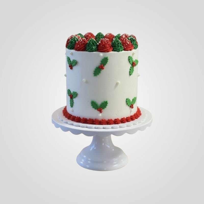The Holly Berry Cake is a classic and pretty choice for your festive season. This smooth white cake is decorated with cute piped holly leaves and red berries scattered around the sides. It features a lovely crown of alternating red and green swirls on top to create a traditional Christmas cake.