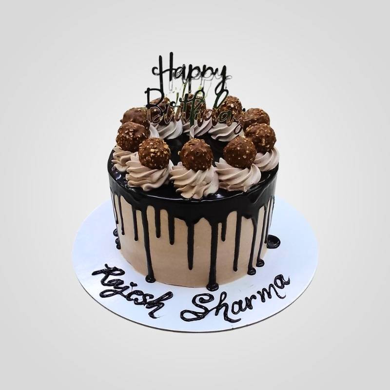 Our bestseller, the Hazelnut Ferrero Rocher Cake, features rich chocolate cake layers filled with a special chocolate crunch and frosted with decadent chocolate frosting. Topped with a luscious chocolate ganache drip and Ferrero, this custom cake embodies indulgence and perfection. A favorite for its irresistible flavor and elegant presentation, it’s no surprise this is one of the best cakes in Sharjah, Dubai, Ajman.