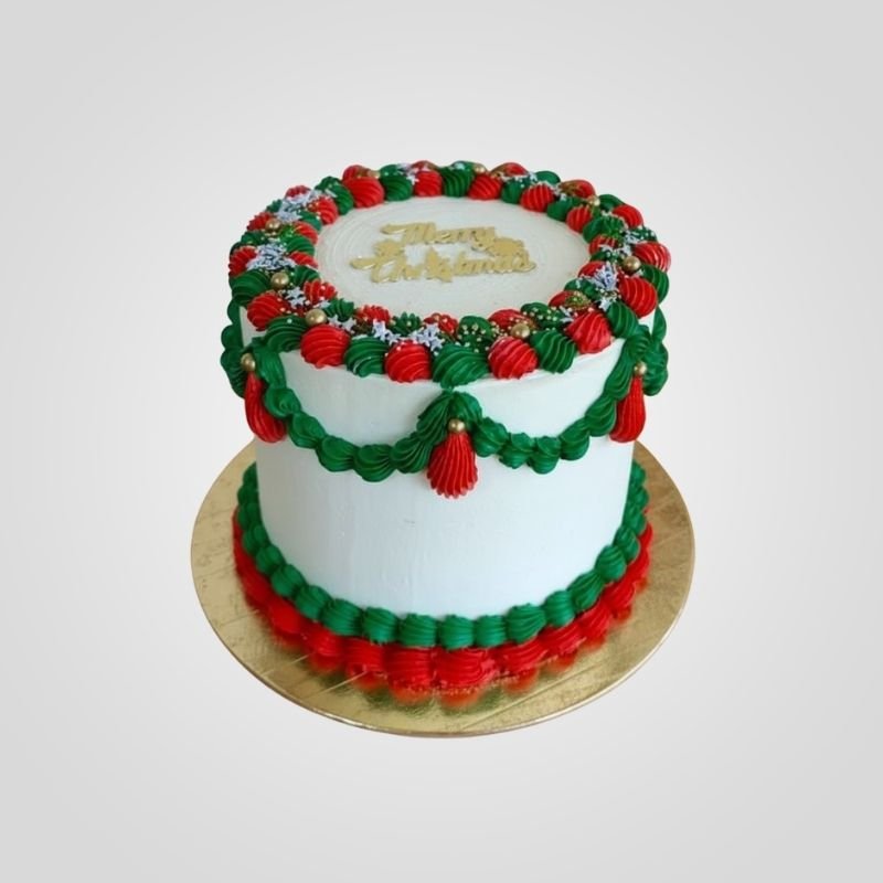 The Merry Christmas cake is a beautiful choice for your holiday celebration. This classic white cake is decorated with lovely red and green piping that looks like festive garlands draped around the sides. It is finished with a shiny gold sign on top to create a very elegant Christmas cake.