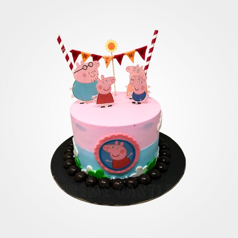 This cheerful Peppa Pig Cake brings the beloved characters to life in the sweetest way. The whole family stands on top of the pink and blue theme cake, celebrating under a sunny, personalized banner. With Peppa also featured on the side, this charming design is crafted with smooth fresh cream, making it both playful and delicious.
