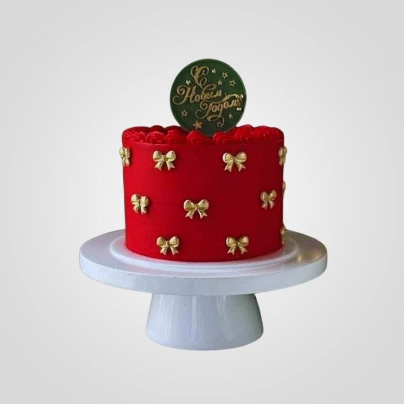 The red and gold cake is a bold and elegant treat for your celebration. This bright red cake is decorated with many small and shiny gold bows all around the sides. It is finished with a deep green sign on top with a gold greeting to create a luxurious Christmas cake or New Year dessert.